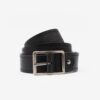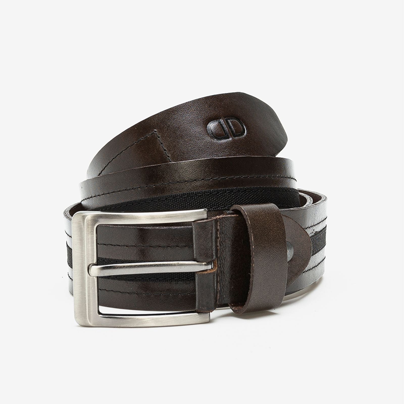 Cinto confeccionado em couro na cor carvão, com uma tira de tecido no meio na cor preta e costura decorativa nas laterais. Fivela de metal, logo da marca na ponta e cinco furos para melhor ajuste.