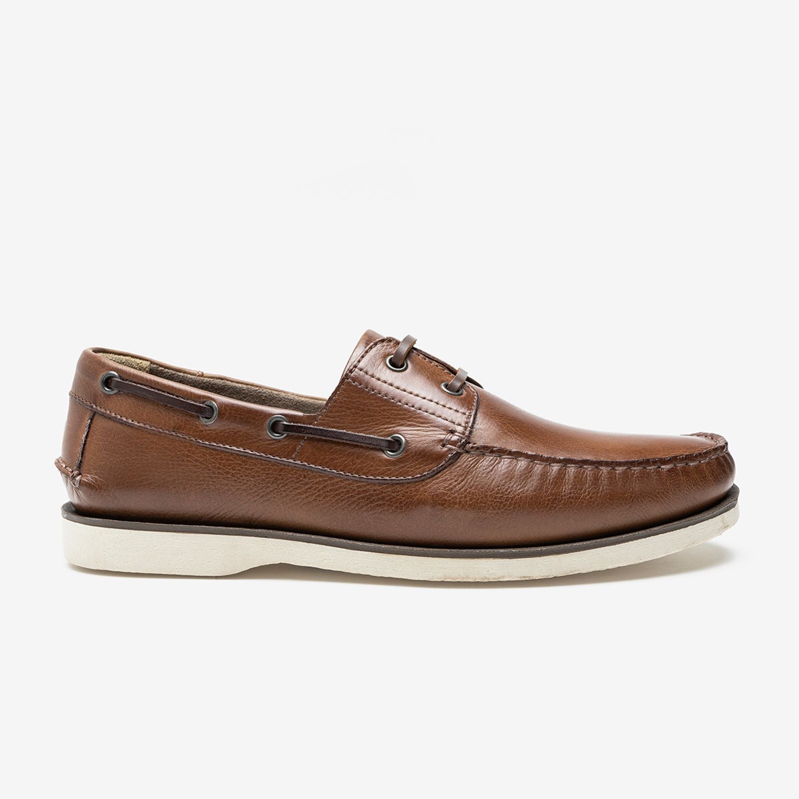 Sider produzido em couro, na cor tan/carvalho. Fechamento em tira de couro com ilhós nos passantes, forro em tecido, tira de couro marrom decorativa em volta do colarinho na parte externa, frente do cabedal costurada a mão. Sola de micro expandido blaqueada com uma pequena faixa de cor café em volta, palmilha macia e bico arredondado.